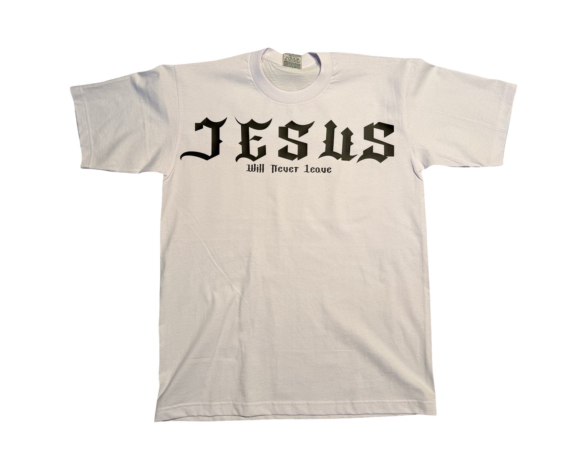 "Jesus Will Never Leave You – Bold Old English Faith Statement Tee"