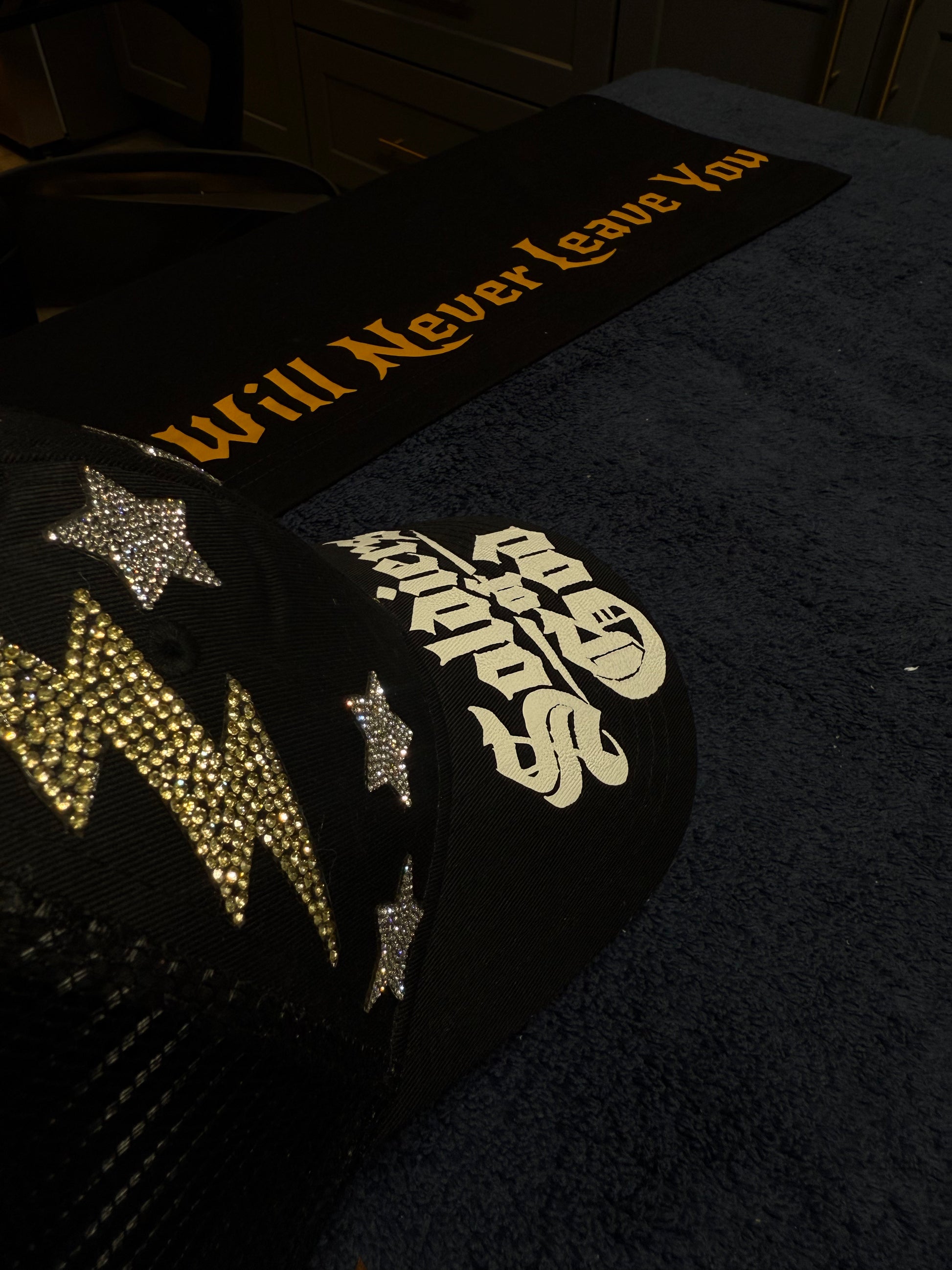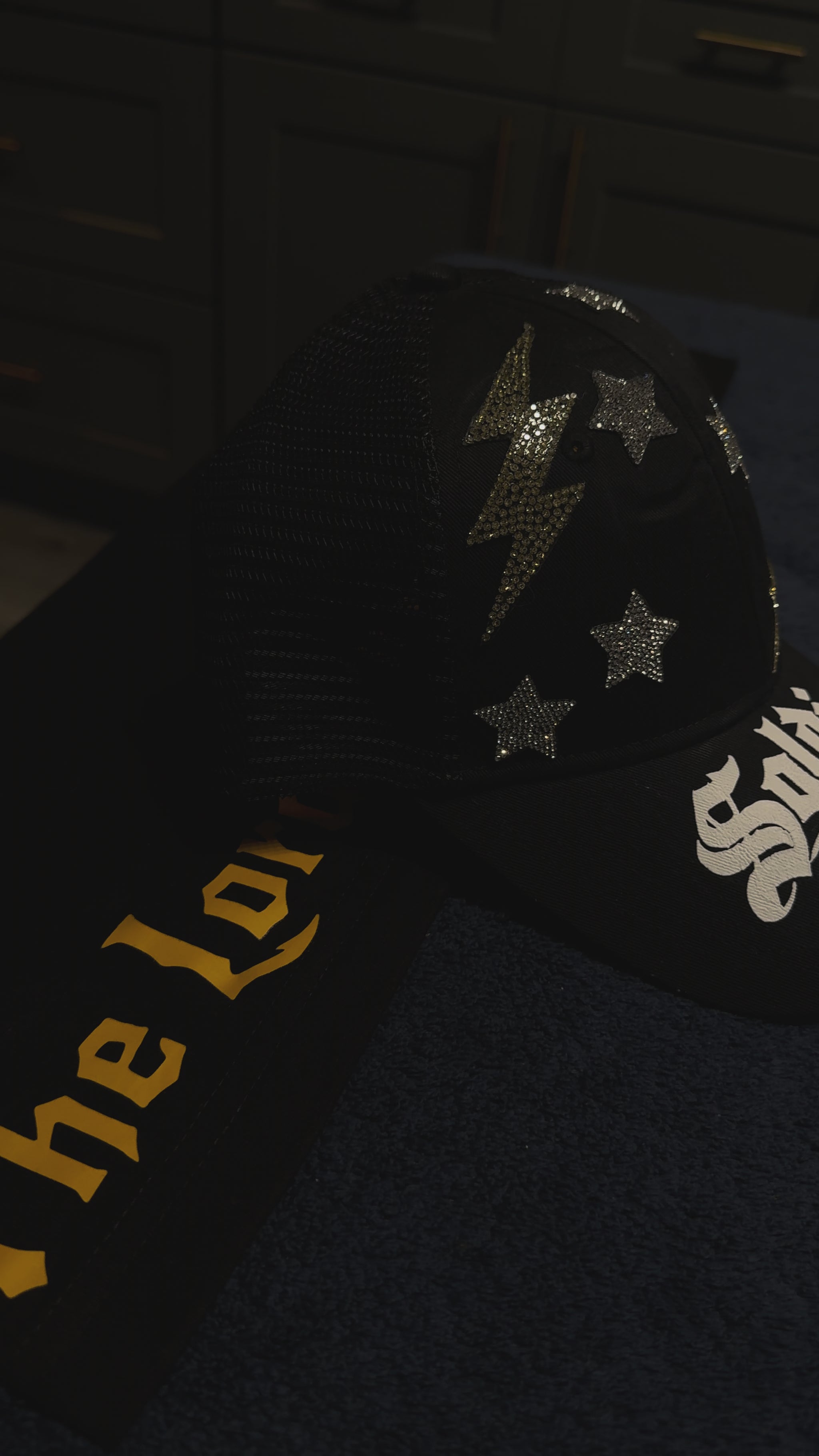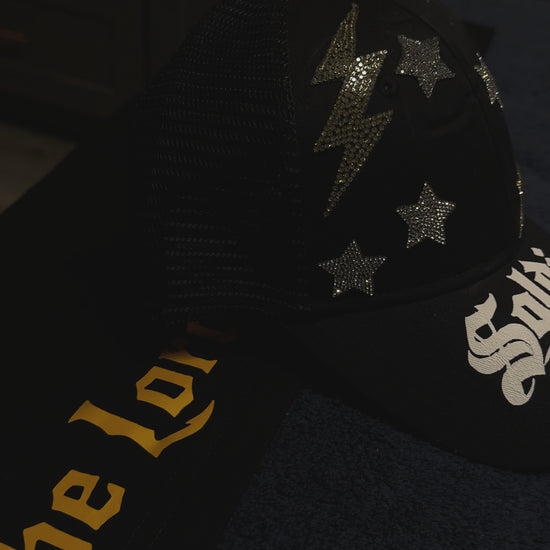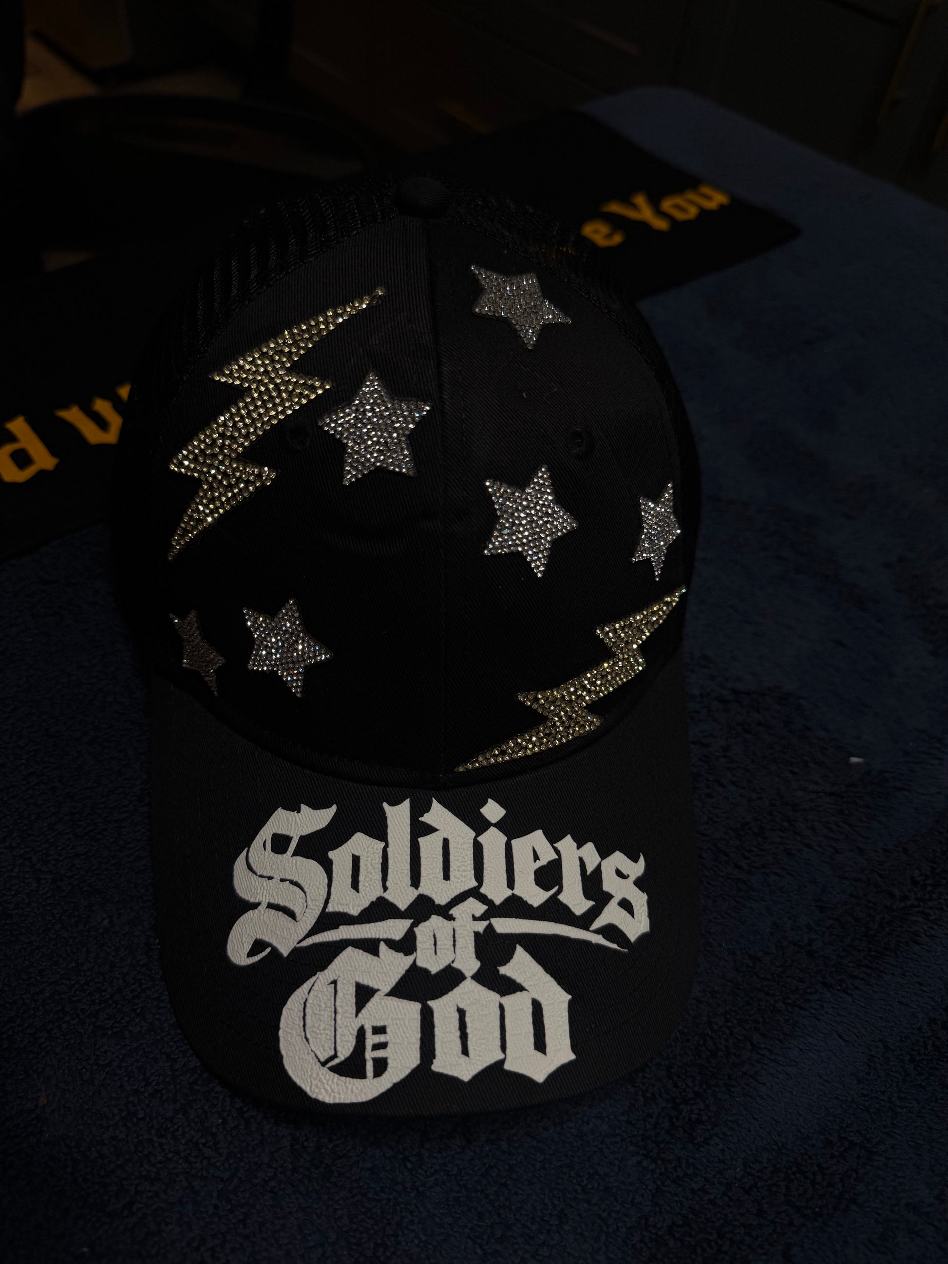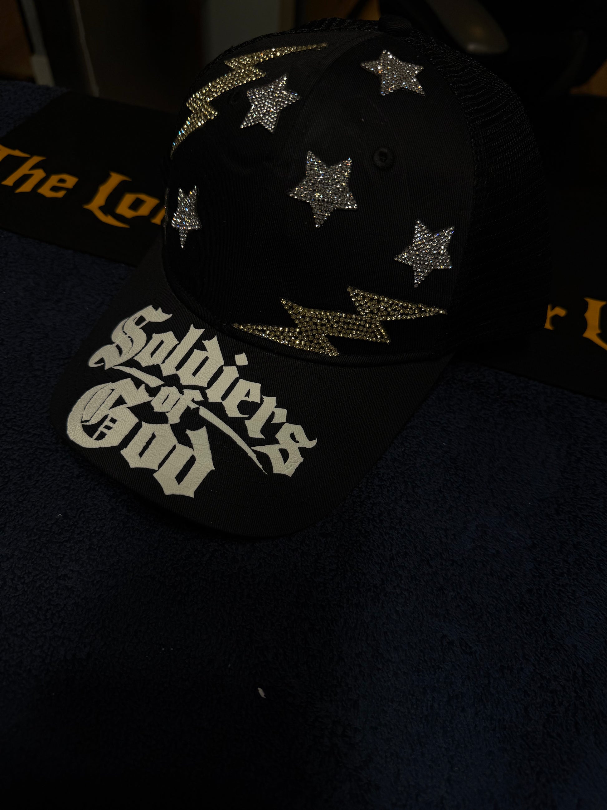 Elevate your style and faith with our one-of-a-kind Soldiers of God hat. This unique piece features a striking puff print on the lid, complemented by custom star and lightning bolt sparkling patches that catch the light beautifully both day and night.